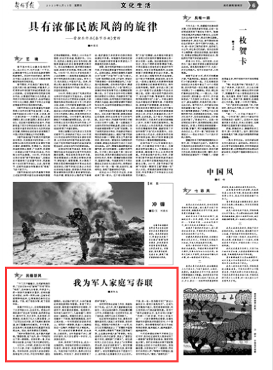 社区领导知道我会书法,请我为军属和退役军人家庭义务写春联,我欣然答应。根据每户的情况我一一去写,先为几位军属家庭送上了“军属院中盈瑞气,光荣牌上满春风”“保家卫国英雄门第,立业建功幸福人家”等春联。有位退役军人刚乔迁新居,我送上“喜居宝地千年旺,福照家门万事兴”。有位退役军人正自己创业,我送上“从军勇做昂头虎,创业甘当俯首牛”。有位军属喜添贵子,我写了“春到风光美,家兴喜事多”。有位军属要贴在乡下老家大门上,说村里人还是喜欢方方正正的字。于是,我一笔一划用楷书写了“家过小康欢乐日,春回大地艳阳天”。还有几位军属是外地人,想把春联寄回家,向父母和亲人们表达新春祝愿。我写下“春风送暖家业兴,兔年吉祥人安康”“和顺一门添百福,平安二字值千金”……大家手捧鲜艳的春联,念着充满新年祈望和美好祝福的字句,个个喜笑颜开。我仿佛看到他们的日子如红艳艳的春联,越来越红火,越来越喜庆,越来越祥和。