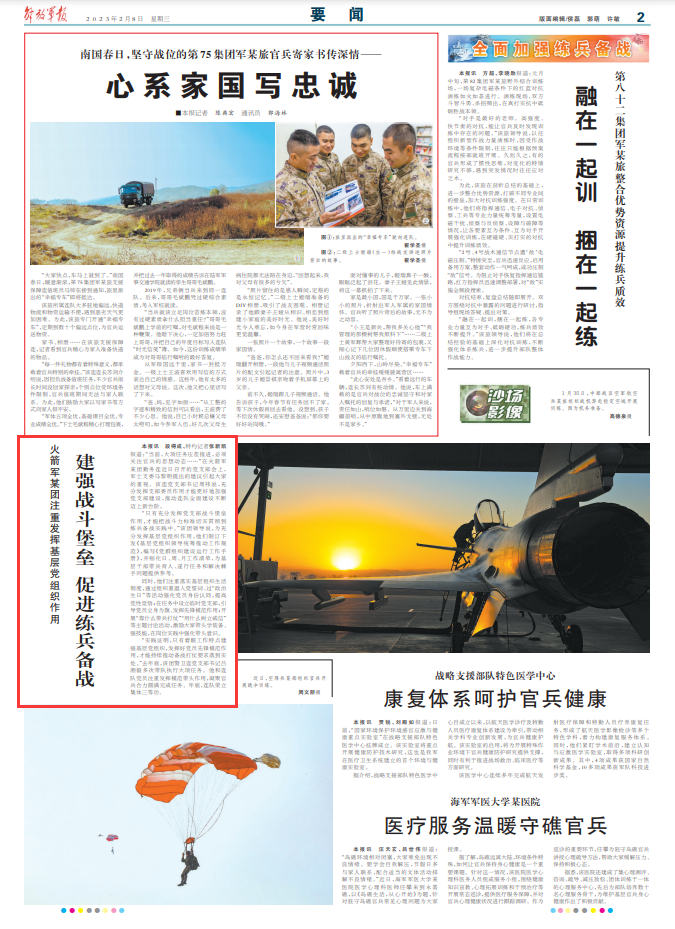 “实践证明,只有着眼工作特点建强基层党组织,发挥好党员先锋模范作用,才能持续推动备战打仗要求落到实处。”去年底,该团警卫连党支部书记吕湘毅多次带队执行大项任务。他和连队党员注重发挥模范带头作用,凝聚官兵合力圆满完成任务。年底,连队荣立集体三等功。