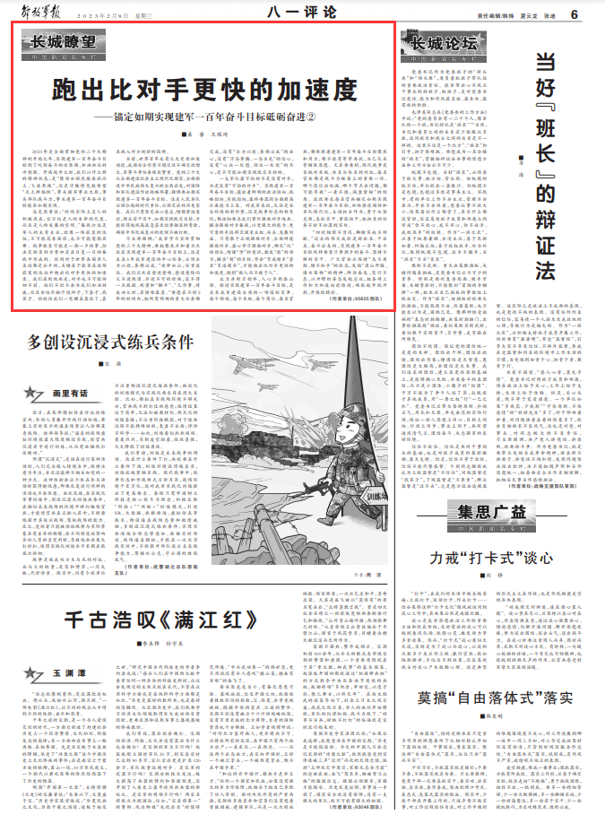 马克思曾说:“时间实际上是人的积极存在,它不仅是人的生命的尺度,而且是人的发展的空间。”备战打仗是军人的主责主业,就像一场寂寞的远征,不可能花香满径,也不可能莺歌燕舞。战争胜负可能是一朝一夕的事,但决定胜负的力量却是在日复一日的备战中形成的。时间对于世界各国军人来说都是公平的,关键在于能否在这场寂寞的远征中跑出比对手更快的加速度。我们在衔枚疾走,对手也不可能徘徊不前。他们不但不会为我们加油助威,而且会绞尽脑汁使绊子、下套子、找茬子。怕就怕我们一觉醒来落伍了,甚至跌入对方挖好的陷阱。