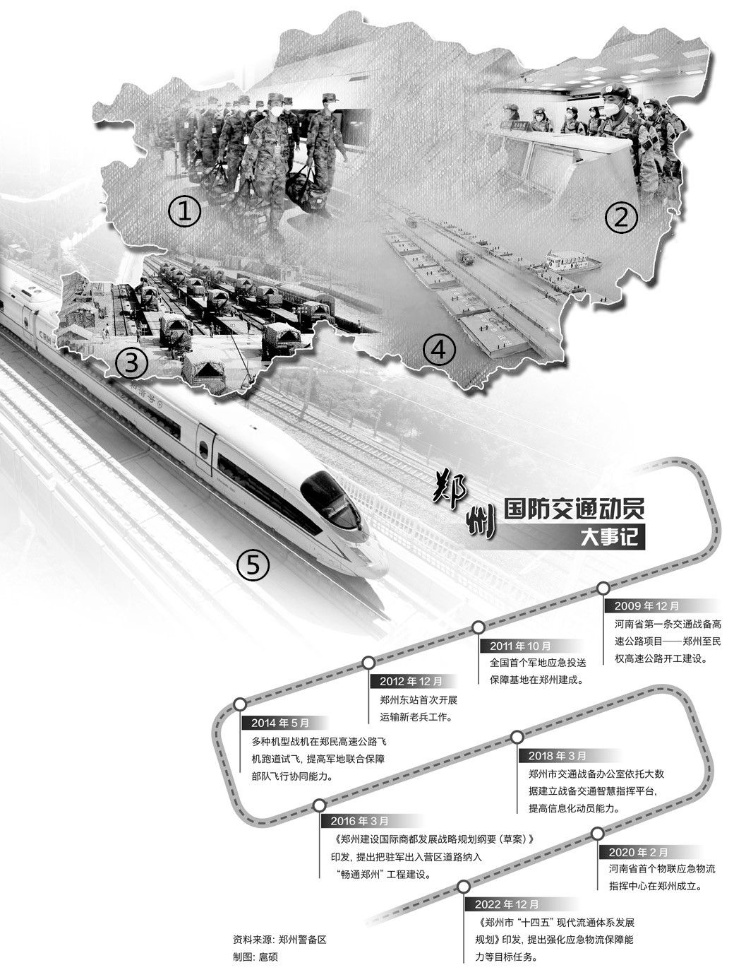 自古兵贵神速。郑州交通的发展变化,不仅带来交通枢纽优势的再造、经济版图的重塑,也为军事交通发展提供了潜力支撑。多年来,郑州军地将军事需求嵌入经济建设同步规划、统筹建设,把区位优势转化为动员潜力,为国防和军队建设提供坚实的交通运输支撑。