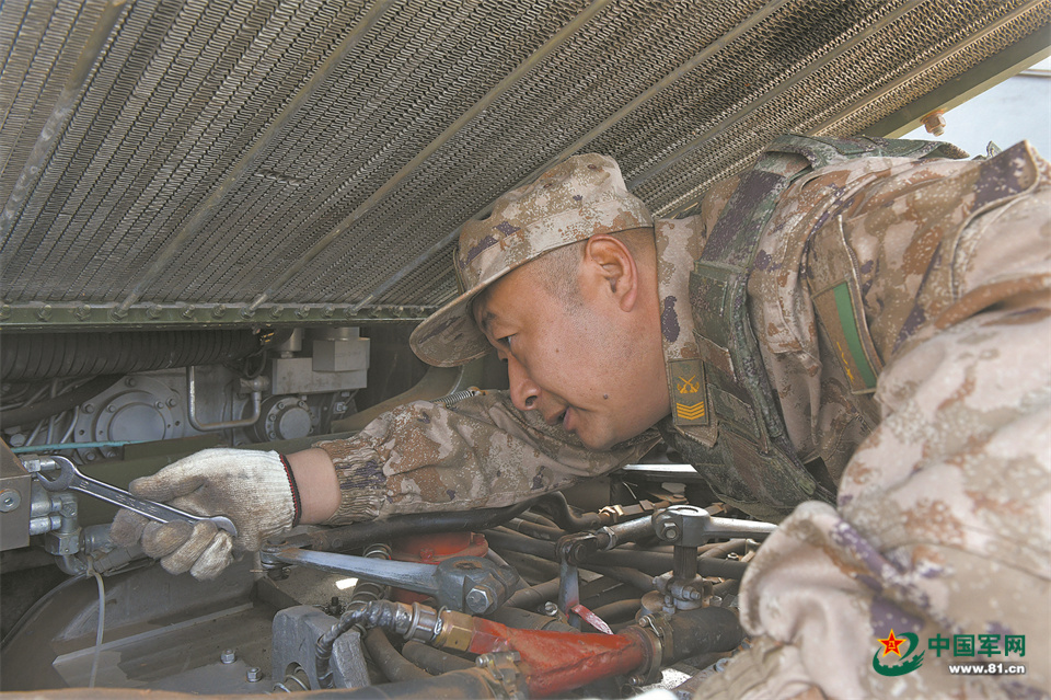 王其金正在检修火炮发动机。石仕胜 摄