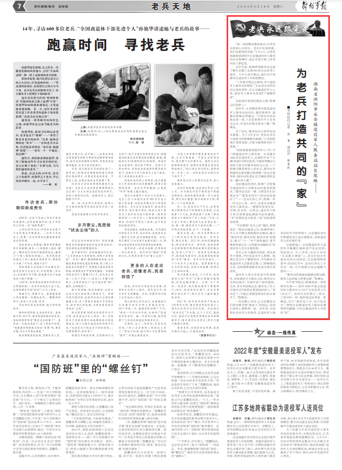 今年春节刚过,陈琳收到一份特殊的礼物——获评2022年度全国退役军人服务中心(站)“百名优秀主任(站长)”。如同当兵时荣立二等功、三等功时一样,他珍视这份荣誉。陈琳说,自己“曾经是个兵、如今是老兵”,要把永安镇退役军人服务站建得更加温暖,守好全镇退役军人共同的“家”。