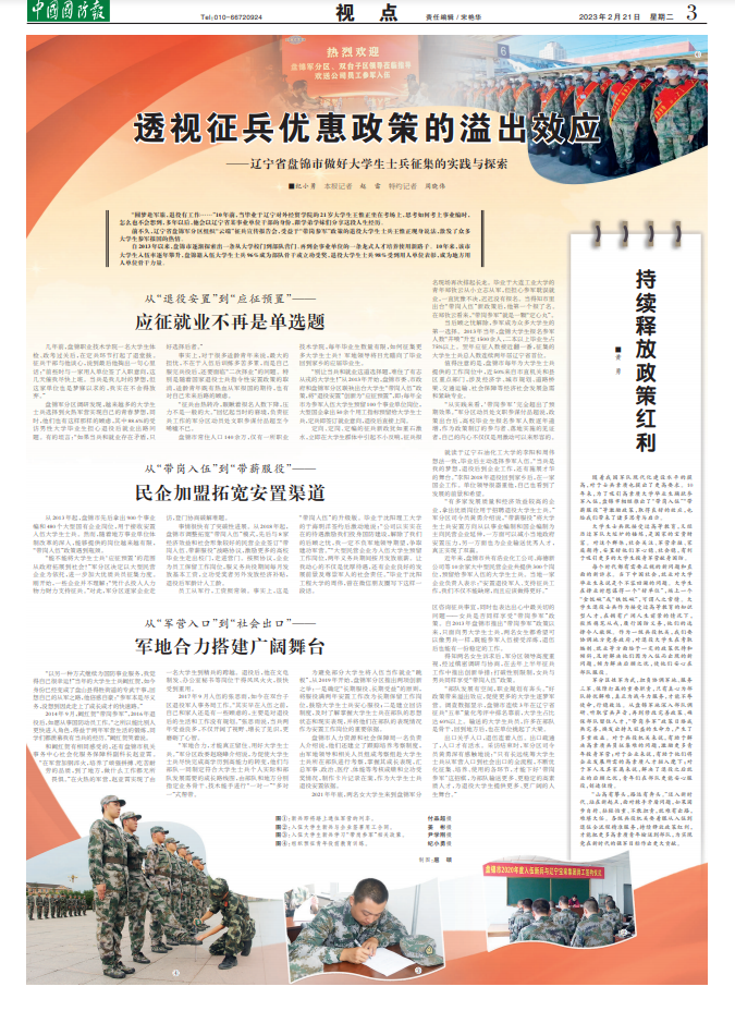 军分区姓军为武,担负协调军地、服务三军、保障打赢的重要职责,只有真心为部队排忧解难,真正为战斗力服务,才能不辱使命,行稳致远。从盘锦军地深入部队调研、听取官兵声音,再到修改完善政策、确保部队留住人才,“带岗参军”政策日臻成熟完善,焕发出持久旺盛的生命力,产生了多重效益。对于兵役机关来说,有助于解决高素质兵员征集难的问题,激励更多青年投身军营;对于企业来说,有助于他们将企业发展所需的高素质人才招入麾下;对于军人及其家属来说,解决了退役之后就业的后顾之忧,青年们在部队更能安心服役,创造佳绩。
