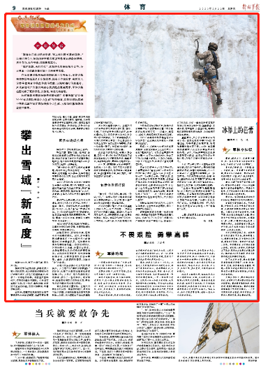 攀冰,被很多人视为一门艺术。冰壁是大自然鬼斧神工创作的艺术品,存在于最寒冷的地方。想要攀越成功,必须综合考虑冰的坡度、厚度、着力点、安全性等多种因素,在冰壁上规划出一条可行的攀登路线,一斧一凿地努力登顶。这既是对体力和技术的考验,也是对胆量和意志的磨砺。官兵之所以能在短时间迅速登顶,不仅因为他们平时力量训练做得充分,攀冰技术过硬,更重要的是,他们团结协作、不畏艰险,内心义无反顾,排除万难也要去争取胜利。