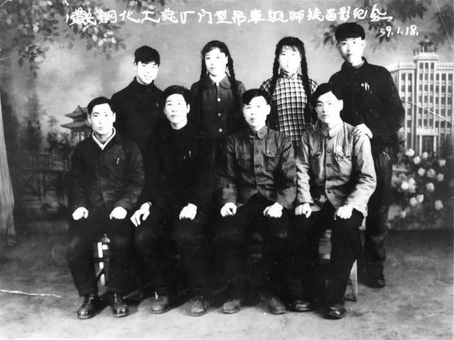 1959年1月18日,鞍钢化工总厂门型吊车班师徒留影纪念,后排左一为雷锋。来源:人民网