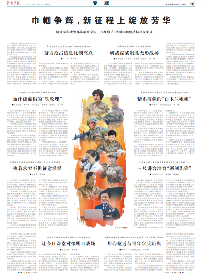 在科技强军的征途上,刘洋砥砺奋进,毫不懈怠。近年来,她相继完成《军事运筹学》《军事定量分析方法》等多部教材出版工作,为军事运筹学学科建设与人才培养付出大量心血。“科研战士的强军梦,让我们甘于牺牲奉献!”刘洋的话语,道出了团队全体成员的心声。