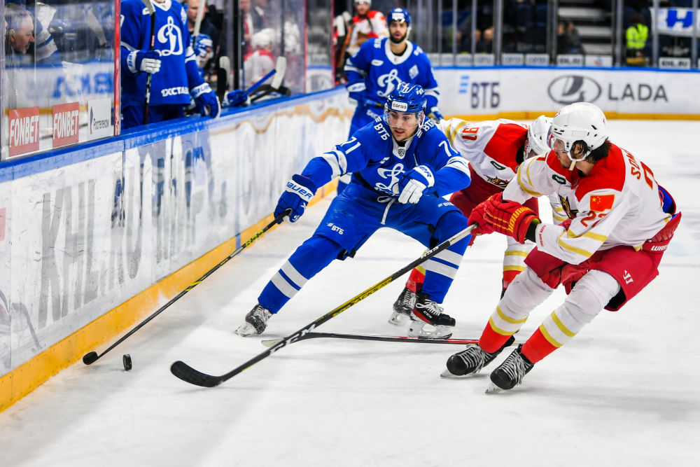 ↑2022年11月19日,中国北京昆仑鸿星队(红色)与俄罗斯莫斯科迪纳摩队在莫斯科举行中俄体育交流年冰球友谊赛。两国元首亲自推动,延续互办国家主题年的友好传统,继“青年友好交流年”“媒体交流年”“地方合作交流年”“科技创新年”后,将2022年和2023年确定为“体育交流年”。
