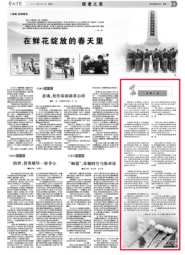 临近清明,旅里特意制作了“云端祭英烈”主题网页。我在“寄语墙”上写道:“张浩、王晓冬两位前辈,请放心,你们未竟的事业,我们来完成!”