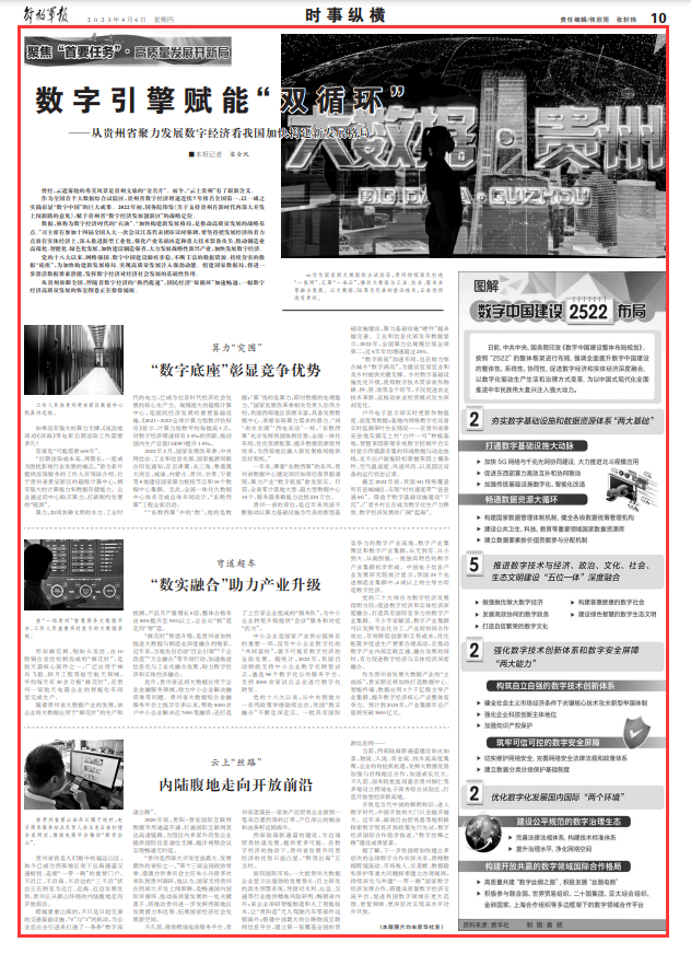 作为全国首个大数据综合试验区,贵州省数字经济增速连续7年排名全国第一,以一域之实践彰显“数字中国”的巨大成果。2022年初,国务院印发《关于支持贵州在新时代西部大开发上闯新路的意见》,赋予贵州省“数字经济发展创新区”的战略定位。