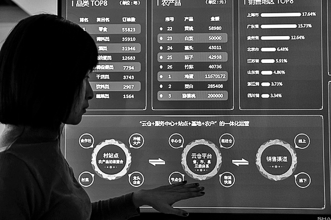 在“一码贵州”智慧商务大数据平台,工作人员查看实时显示的大数据系统。