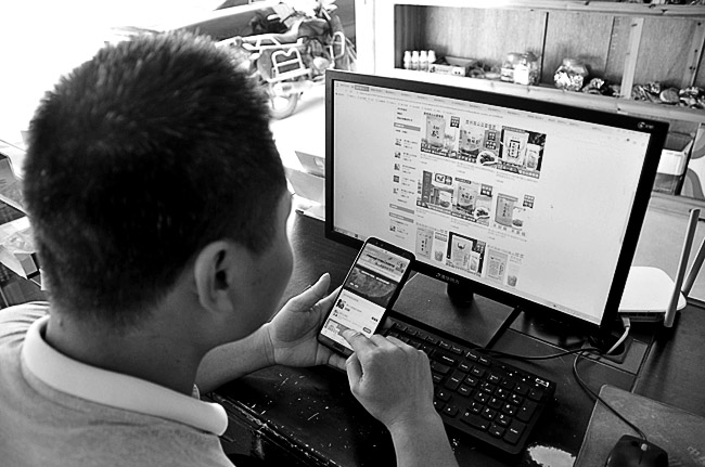 在贵州省雷山县丹江镇干皎村,电子商务服务站点负责人余玉龙正在打理自家网店,借助电商平台推动“黔货出山”。