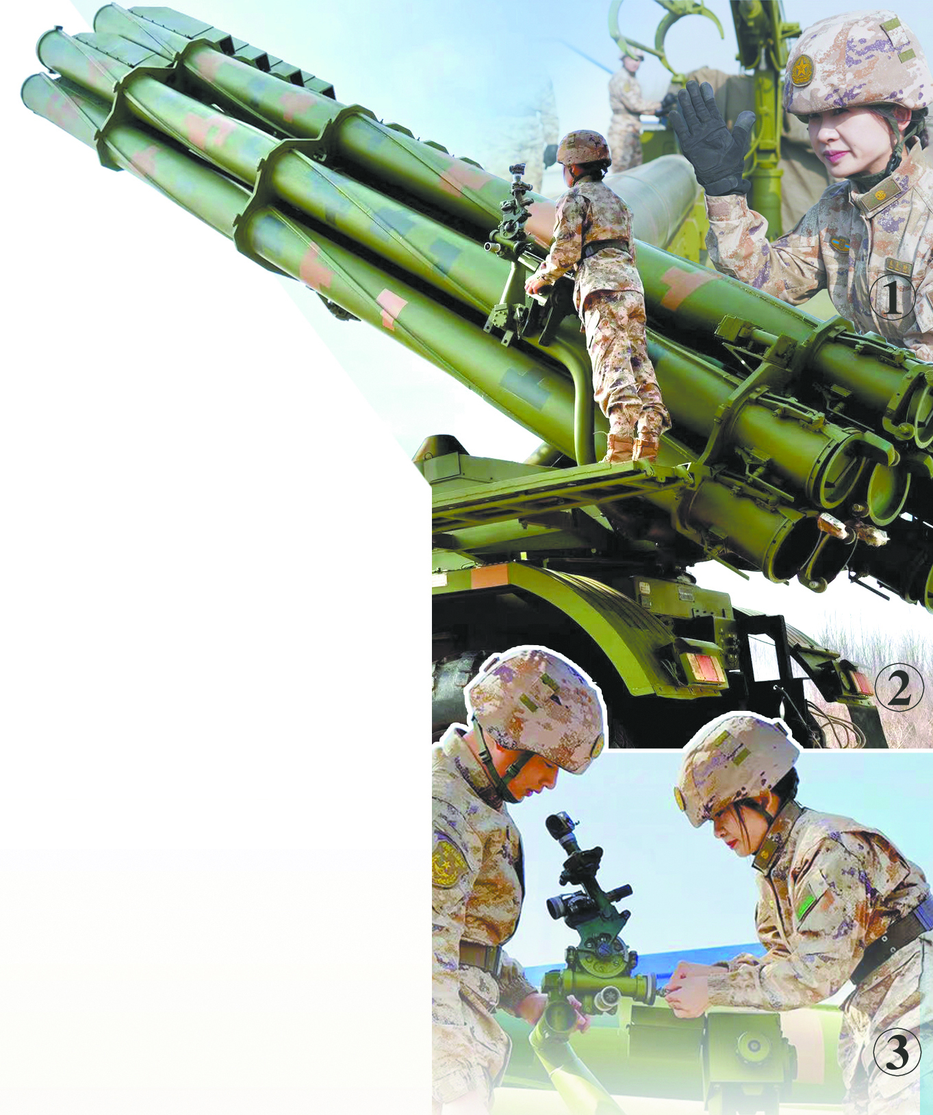 记者张东盼在教练员指导下开展远火对接装填训练(图①)。供图:王海洋