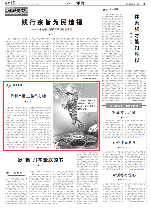 平时多练一手,战时才有备无患。善战者,在与强敌交锋时既能“以己之长击敌之短”,更能“以己之长克敌之长”。只有“甜点位”足够丰富,不断拓展抢占新的“甜点位”,才能确保遭遇任何战场态势都能够措置裕如。如果依旧满足于几个传统的“甜点位”,战场上可能会被敌掣肘,缺乏应敌后手,原有的“甜点位”也会成为“劣势位”。我们应以更宽广的视野、更深刻的认识和更高明的胆略,积极练强夺敌所恃、破彼之强的“甜点位”,抢占优势、掌握主动,实现作战效果的最大化,夺取未来战场上的胜利。