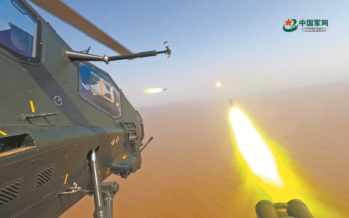 “西南方向发现‘敌’不明飞行物!”训练中,指挥组临机导调。接到攻击命令,两架武装直升机在空中交叉掩护,低空隐蔽接近目标;占领攻击阵位后,分别从不同方向锁定目标并实施打击。