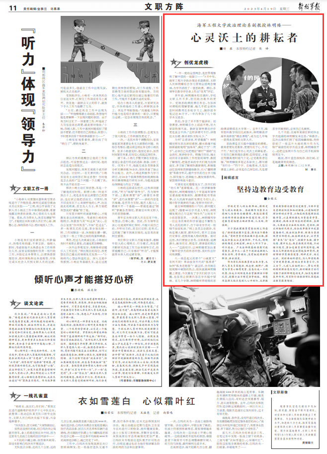 就在林明臻刚松口气时,新问题又出现了:随着00后学员进入军校,林明臻发现自己与这些“网生代”之间有不小的思想差异。一次课上,林明臻列举一位出身贫寒的科学家通过不懈努力考入名校的例子,台下却有学员对一些细节窃窃私语。“网上各类言论混杂,有些是博人眼球、跟风炒作,更不乏歪曲历史事实、诋毁英雄人物的现象。面对这些,我们要独立思考,分辨真假,追溯源头,做知历史、明是非、辨善恶的明白人……”这段经历,让林明臻更加注重了解年轻学员的所思所想,及时作出针对性调整。