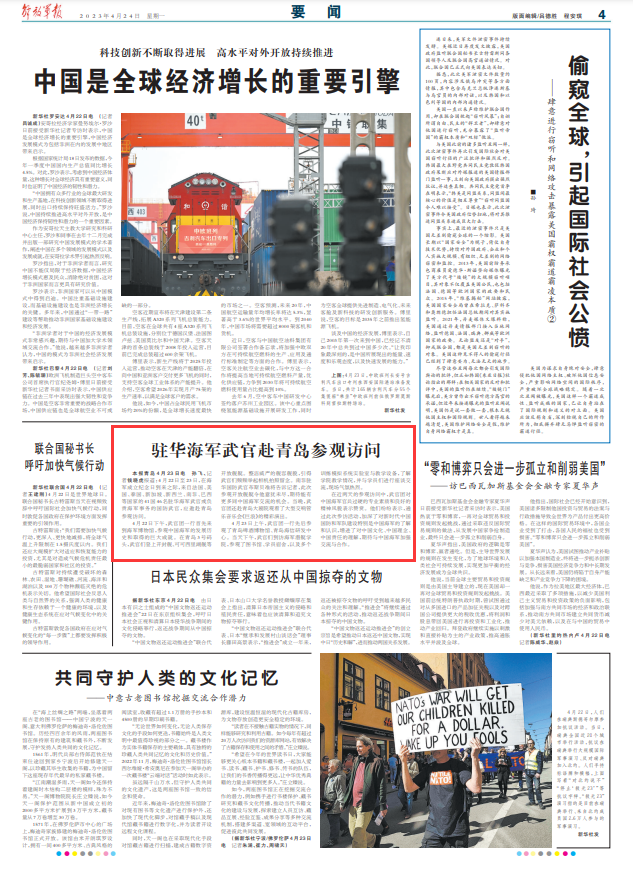 解放军报青岛4月23日电 孙飞、记者钱晓虎报道:4月22日至23日,在海军成立纪念日到来之际,来自法国、美国、泰国、新加坡、新西兰、南非、巴西等国家的41国46名驻华海军武官或负责海军事务的国防武官,应邀赴青岛参观访问。