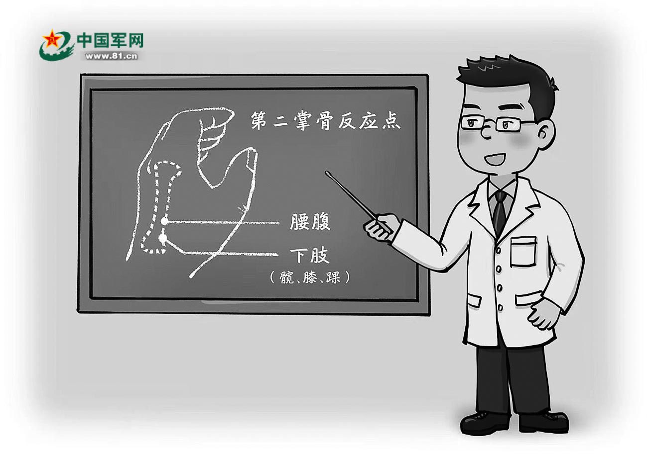 除上述自治互治技术外,还可以通过按压第二掌骨反应点缓解疼痛症状。手掌的第二掌骨是与食指连接的骨头。当身体出现疼痛症状时,按压受伤同侧第二掌骨反应点,会出现明显压痛。腰部反应点大约位于第二掌骨近端四分之一处,髋、膝、踝部的反应点大约位于第二掌骨根部。当髋、膝、踝、腰等部位疼痛时,可按压对应的反应点,同时配合患部轻微活动。建议每天3次,每次3分钟。如出现踝关节疼痛症状时,可用拇指或筷子头按压踝部反应点。此时,按压处会出现明显压痛。踝痛越严重,压痛越明显。按压的同时配合踝关节活动,直至疼痛症状减轻或消失。
