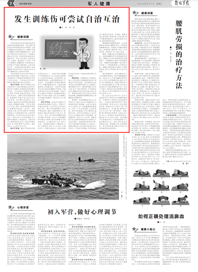 军事训练伤是军事训练导致的机体组织结构或器官损伤。研究发现,部队新兵军事训练伤的发生率较高,主要以骨骼肌肉系统损伤为主,如踝关节损伤、髋膝关节损伤和腰椎损伤等。如果发生训练伤后未及时治疗,可能错过最佳治疗时机,导致伤情加重或延长康复时间。因此,伤后及时、有效的治疗十分重要。通常情况下,骨折、严重半月板撕裂、肌腱断裂、马尾神经综合征等较为严重的训练损伤,应及时就医治疗。其他较轻的训练损伤,如肌肉酸痛、肌肉拉伤等,可通过自治互治技术缓解症状,达到治疗效果。