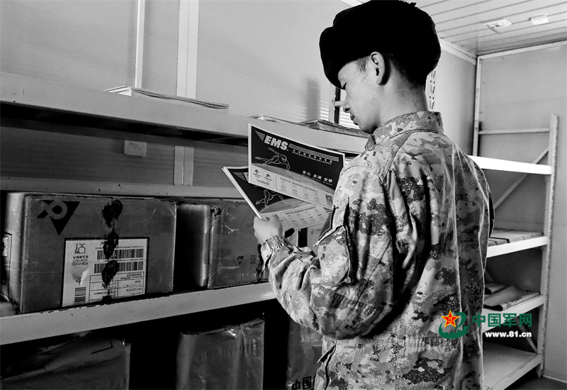 上等兵曾德海取走了网购的考学资料;列兵石语昆领取了家乡特产;中士蔡长武迫不及待地拆开包裹,看着妻子寄来的羊绒衫,脸上洋溢着开心的笑……