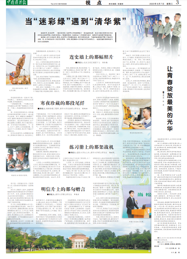 时光流转,每每聆听前辈的故事,年轻的听者眼中满是敬佩,胸中热血滚烫。一代人有一代人的长征,2005年至今,先后有数百名清华学子携笔从戎,他们屹立山巅观天测海,驾驶战车呼啸奔驰,逐梦远航护卫空天,在军营建功立业,完成青春淬炼。更有许多清华学子心系国防,将学习科研目标锚定国防科技领域,将知识力、创造力转化为国防和军队现代化的科技力和推动力。