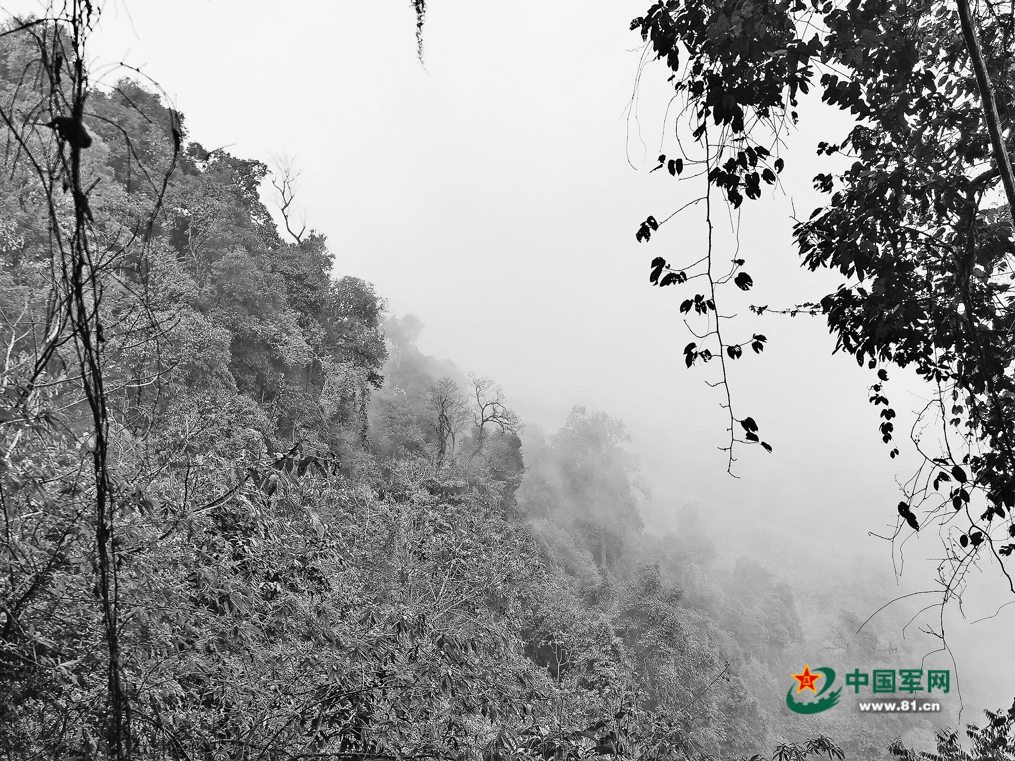 已是傍晚,不知不觉官兵已走到第六层大山。雨歇了,气温降下来,雾也薄了,植物叶片上的流水滴落在低一层的叶片上,一滴接着一滴,山谷中响起左一声“啪”、右一声“咚”的节奏。