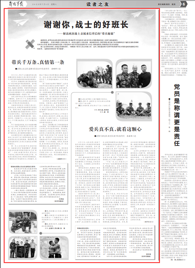 带兵千万条,真情第一条。我们的身边,还有很多好班长。他们的带兵方法不尽相同,但有一点一定是相通的,那就是用情用爱关心战友。唯以真情能换真心,唯以真爱能暖兵心。