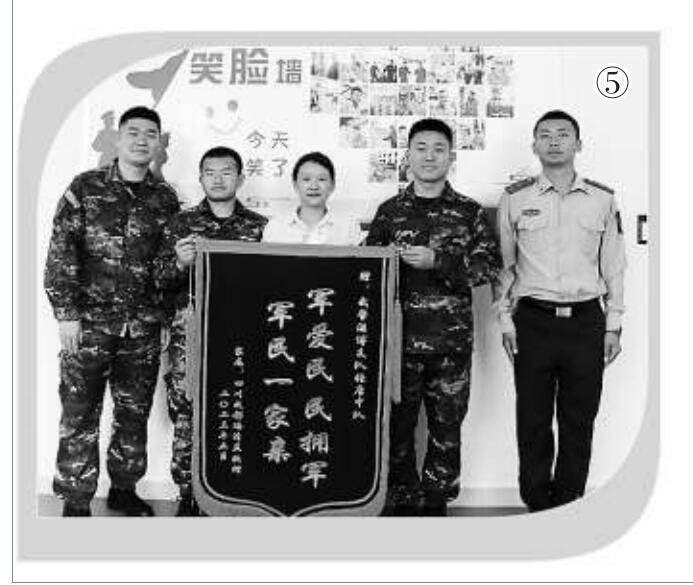 冯清蓝(中)送锦旗时与中队长孙康(左一)、冯建宏(左二)、指导员房聪祥(右二)、班长陈相鹏(右一)合影。