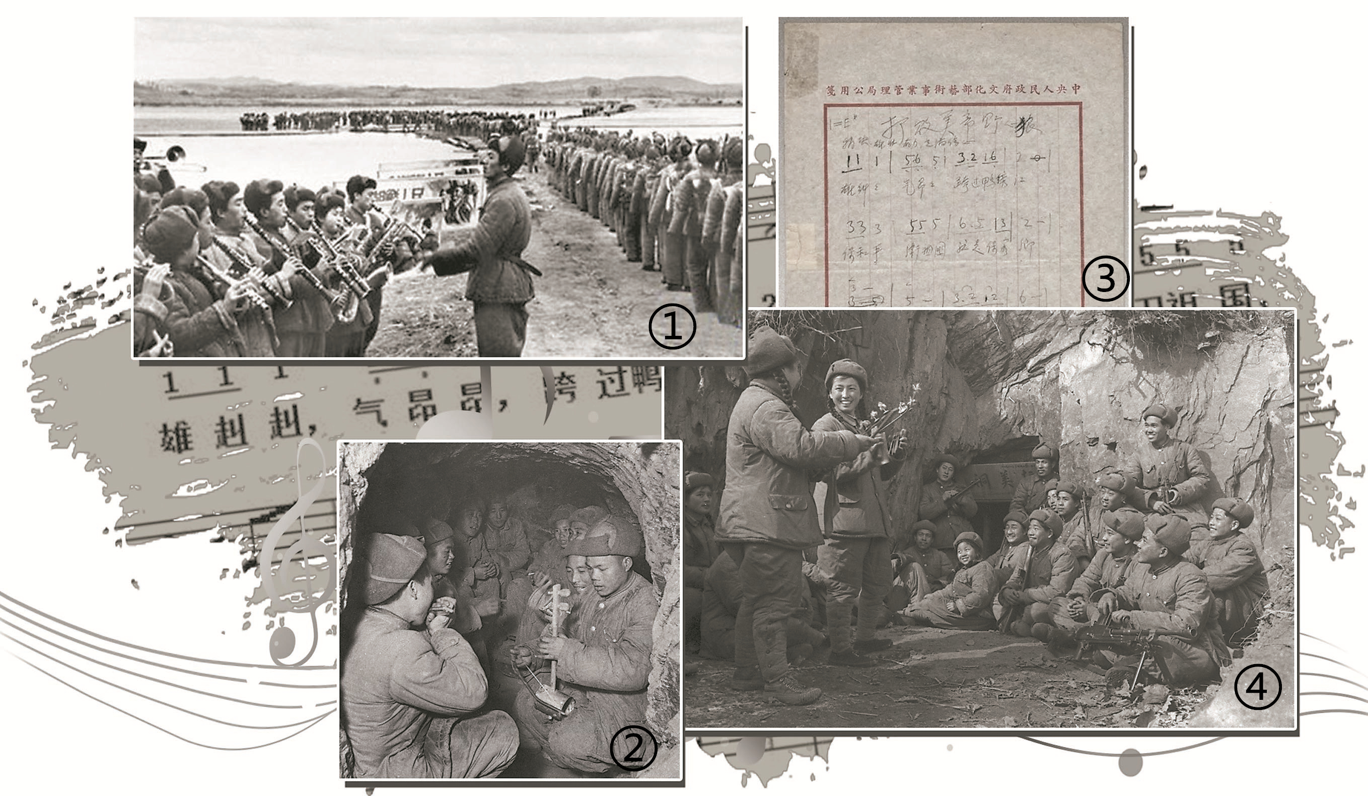 图①:雄赳赳,气昂昂,志愿军将士跨过鸭绿江。图②:战斗间隙,志愿军战士在坑道口演奏乐曲。图③:《中国人民志愿军战歌》手稿。图④:志愿军第39军文工团文艺战士穿越敌人封锁线,到前线慰问演出。