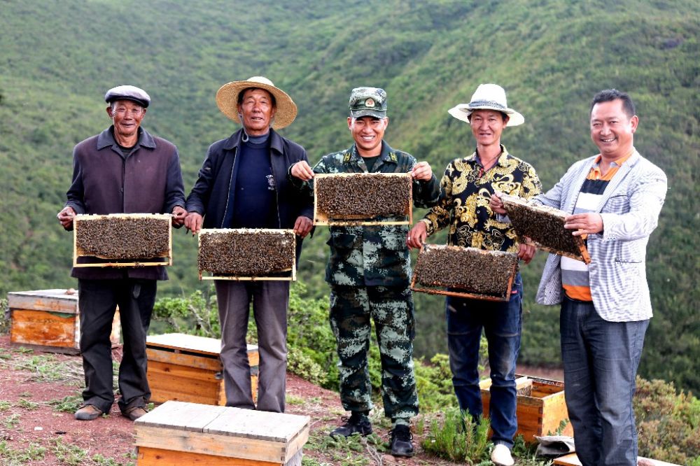 ↑武警四川总队凉山支队精准帮扶昭觉县梭梭拉打村发展养蜂产业,总队驻村扶贫干部布哈(中)和村民一同展示丰收成果(2019年6月12日摄)。新华社发(杨剑 摄)