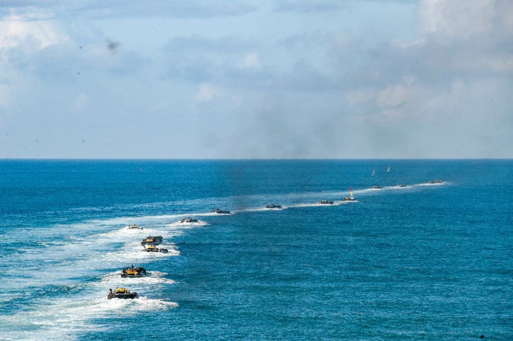 ↑第74集团军某旅“硬骨头六连”官兵驾驶两栖步战车在海上进行实战化训练(2020年8月14日摄)。新华社发(李彬 摄)