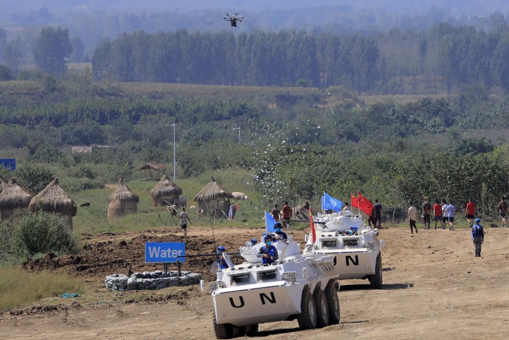 ↑2021年9月15日,在“共同命运-2021”国际维和实兵演习综合演练中,维和分队采用无人机抛撒传单宣传和平理念。新华社记者 刘芳 摄