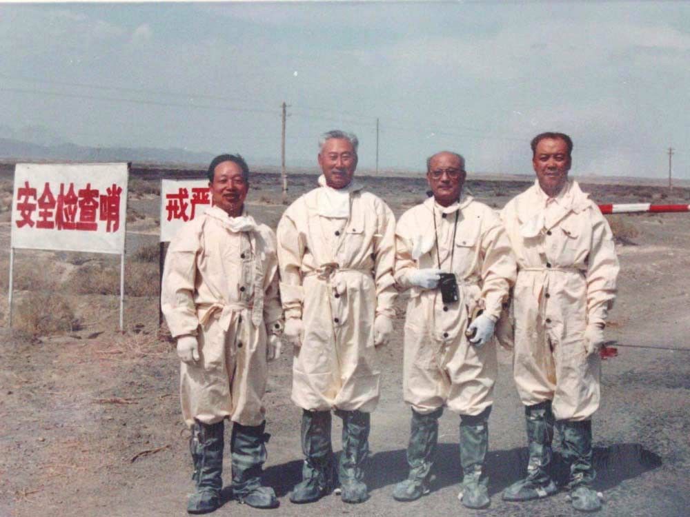 ↑一次核爆炸试验后,林俊德(左一)和参试人员从试验场区完成取样任务后合影留念(资料照片)。新华社发