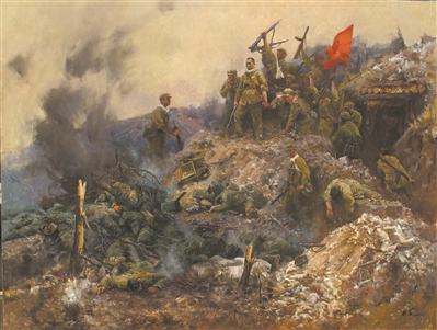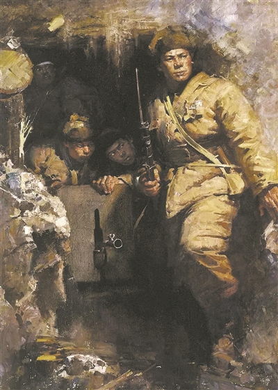 血与火交织的上甘岭战役中,中国人民志愿军与敌鏖战43天,给敌人以沉重打击,打出了我军的指挥艺术、战斗作风和团结精神。上甘岭战役和志愿军英雄事迹,成为艺术家着力表现的内容。周祖铭的《上甘岭》、伍必端的《上甘岭战役》、范笛宽的《英雄阵地上甘岭》等油画,色彩明朗热烈,与人物精神状态、场面气氛相得益彰,折射出志愿军将士英勇顽强、血战到底的主题思想。何孔德的《并肩作战》将人物形象表现得既真实可信又充满艺术感,彰显志愿军战士舍生忘死的革命英雄主义精神。王铁牛在《上甘岭战役》中用刚健的笔调手法、雄强的艺术语言形式,将战斗场面刻画得极具冲击力,营造出宏大悲壮的战争场景。许宝中的油画《上甘岭——水》,没有直接描绘两军对峙的激烈战斗场面,而是通过对一位志愿军战士冒着生命危险抢水情节的刻画,从侧面反映了战争的艰苦。画面上,志愿军战士匍匐取水的姿势淡定从容,彰显其坚毅乐观、勇于牺牲的高贵品质。崔开玺的《上甘岭最后的屹立者》通过阵地上大片倒下的人物与寥寥屹立者的对比,揭示战争的艰难与残酷,展现胜利来之不易。
