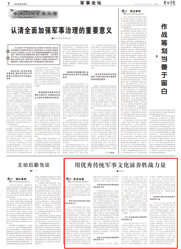 中华优秀传统军事文化,是中华优秀传统文化的重要组成部分,是当代中国先进军事文化之源。实现党在新时代的强军目标,应注重挖掘中华优秀传统军事文化的价值,善于用中华优秀传统军事文化积淀强军胜战的精神力量。