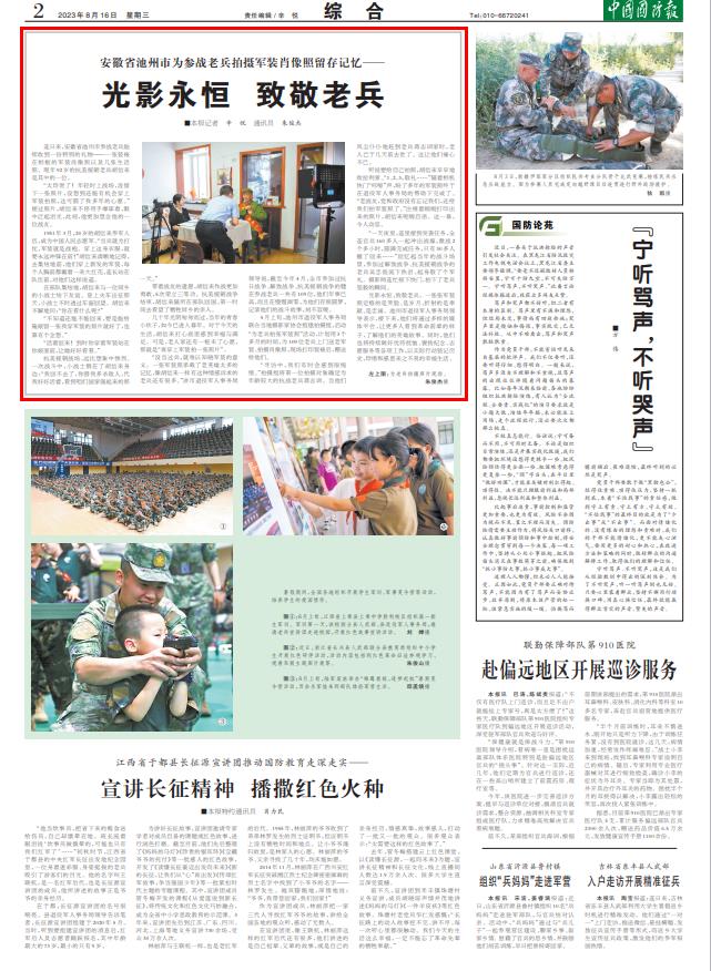 5月上旬,池州市退役军人事务局联合当地摄影家协会组建拍摄组,启动“为老兵拍张军装照”活动,计划用3个多月的时间,为109位老兵上门送老军装、拍摄肖像照,现场打印装裱后,赠送给他们。