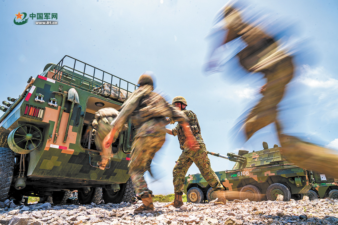 第73集团军某旅火力分队炮班成员登车。
