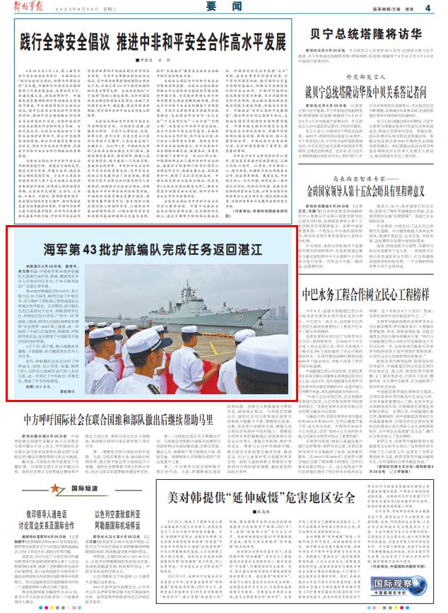 解放军报湛江8月29日电 唐思宇、吴亢慈报道:中国海军第43批护航编队在圆满完成护航、联演、撤离我在苏丹人员和访问任务后,于29日顺利返回广东湛江某军港。