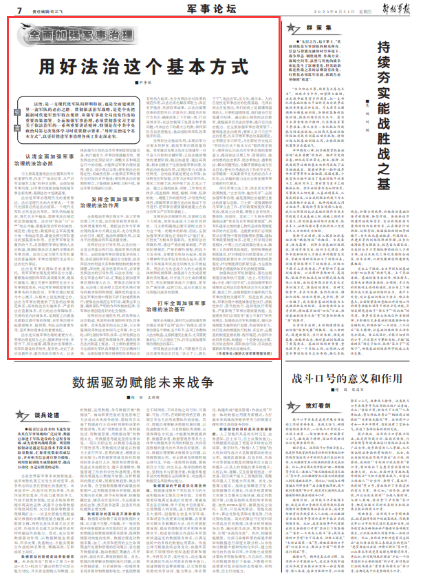 习主席高度重视法治在建军治军中的重要作用,作出了“依法治军、从严治军是强军之基”的科学论断。全面加强军事治理,以军事治理新加强助推强军事业新发展,强调法治才是硬道理。