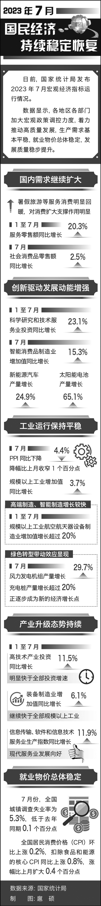 “从7月份的主要经济指标来看,我国经济持续恢复,总体回升向好。”生产需求基本平稳、就业物价总体稳定、发展质量稳步提升,张立群用几个“稳”字总结国民经济发展态势。