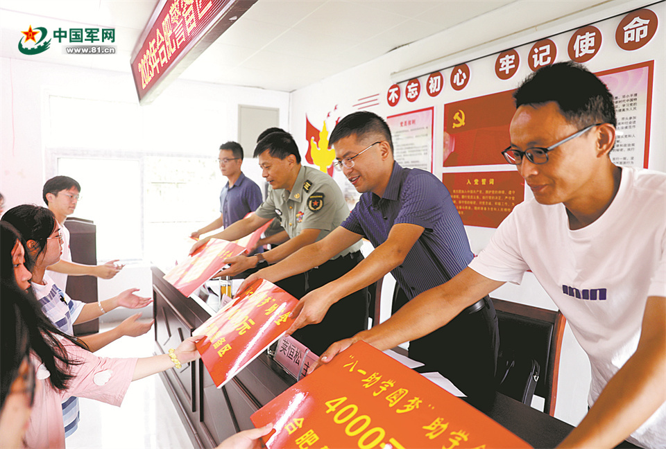 合肥警备区领导和驻村干部为今年考取大学的困难学生发放助学金和结对帮扶卡片。朱怡蘅 摄