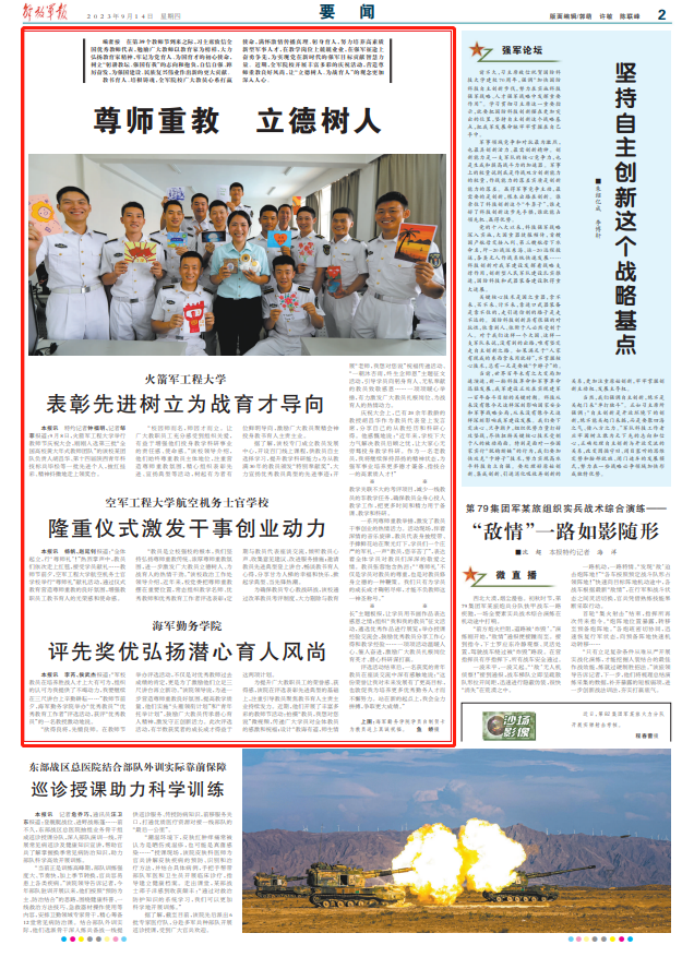 教书育人、培根铸魂,全军院校广大教员心系打赢使命,满怀激情传播真理、躬身育人,努力培养高素质新型军事人才,在教学岗位上兢兢业业,在强军征途上奋勇争先,为实现党在新时代的强军目标贡献智慧力量。近期,全军院校开展丰富多彩的庆祝活动,营造尊师重教良好风尚,让“立德树人、为战育人”的观念更加深入人心。