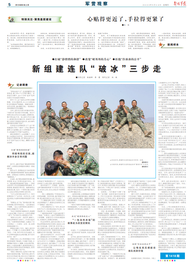 那年7月,这个连队由多单位调整组建。官兵合编容易,合心合力却是连队当时面临的严峻挑战。组建后的第一次评功评奖,连队颗粒无收,一股消极沮丧的情绪在官兵间蔓延。