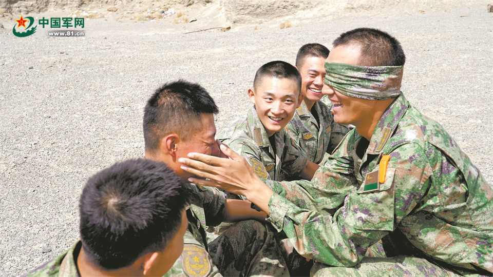 训练间隙,新疆军区某团某连组织“蒙眼识兵”小活动。秦锐森摄