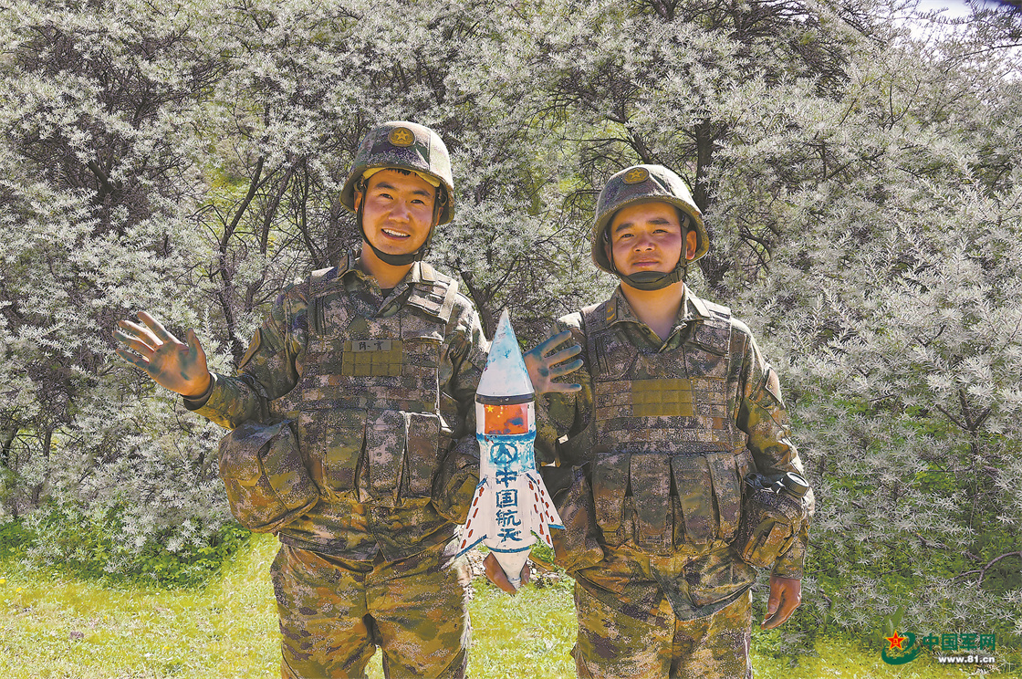 中士陈宵(左)、二级上士李双双一起展示他们设计的水火箭。