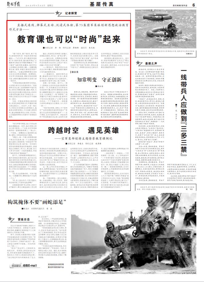 教育之光,思想为魂。课堂作为开展教育的主战场、传播思想的主阵地,必须紧盯时代变化、官兵需求,做到与时俱进。第73集团军某旅创新授课形式,为课堂注入网络时尚元素,激发了教育新活力,这一做法值得参考借鉴。