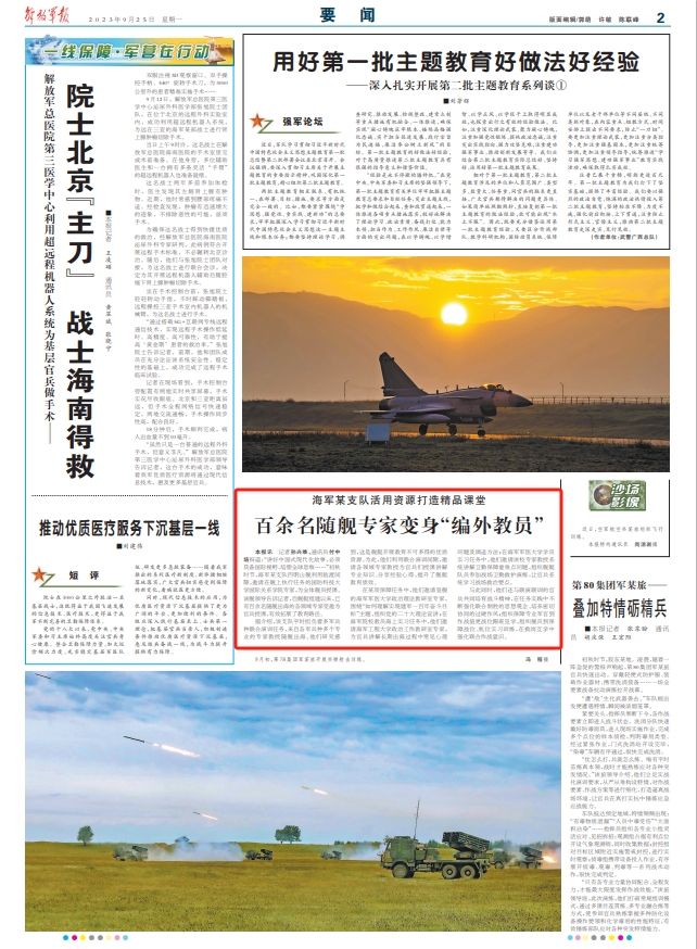 解放军报讯 记者孙兴维、通讯员付中培报道:“讲好中国式现代化故事,必须具备国际视野、培塑全球思维……”初秋时节,海军某支队四明山舰利用航渡间隙,邀请在舰上执行任务的国防科技大学国际关系学院专家,为全体舰员授课。该舰领导告诉记者,自舰艇组建以来,已有百余名随舰出海的各领域专家受邀为官兵授课,有效拓展了教育路径。