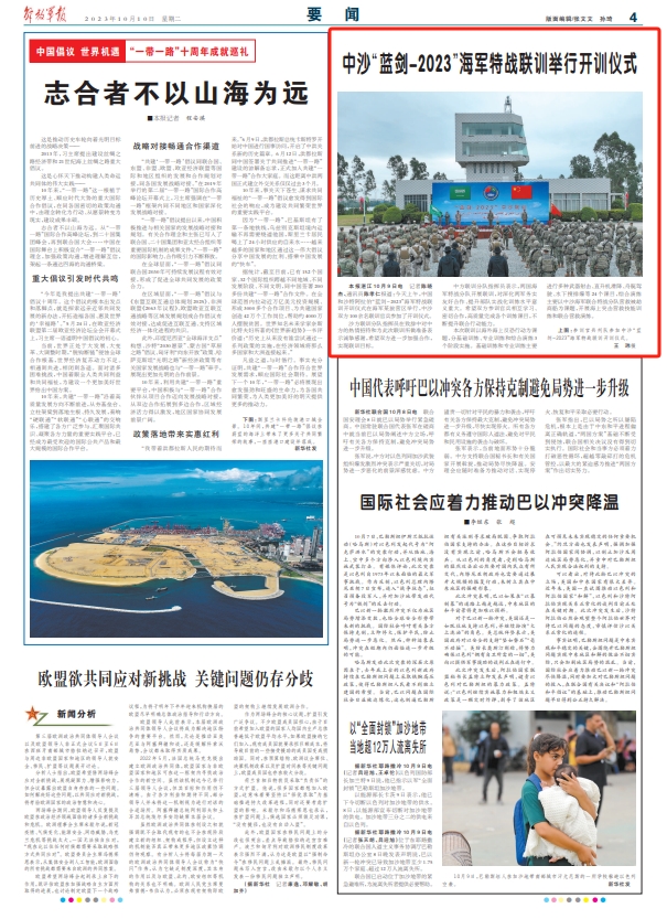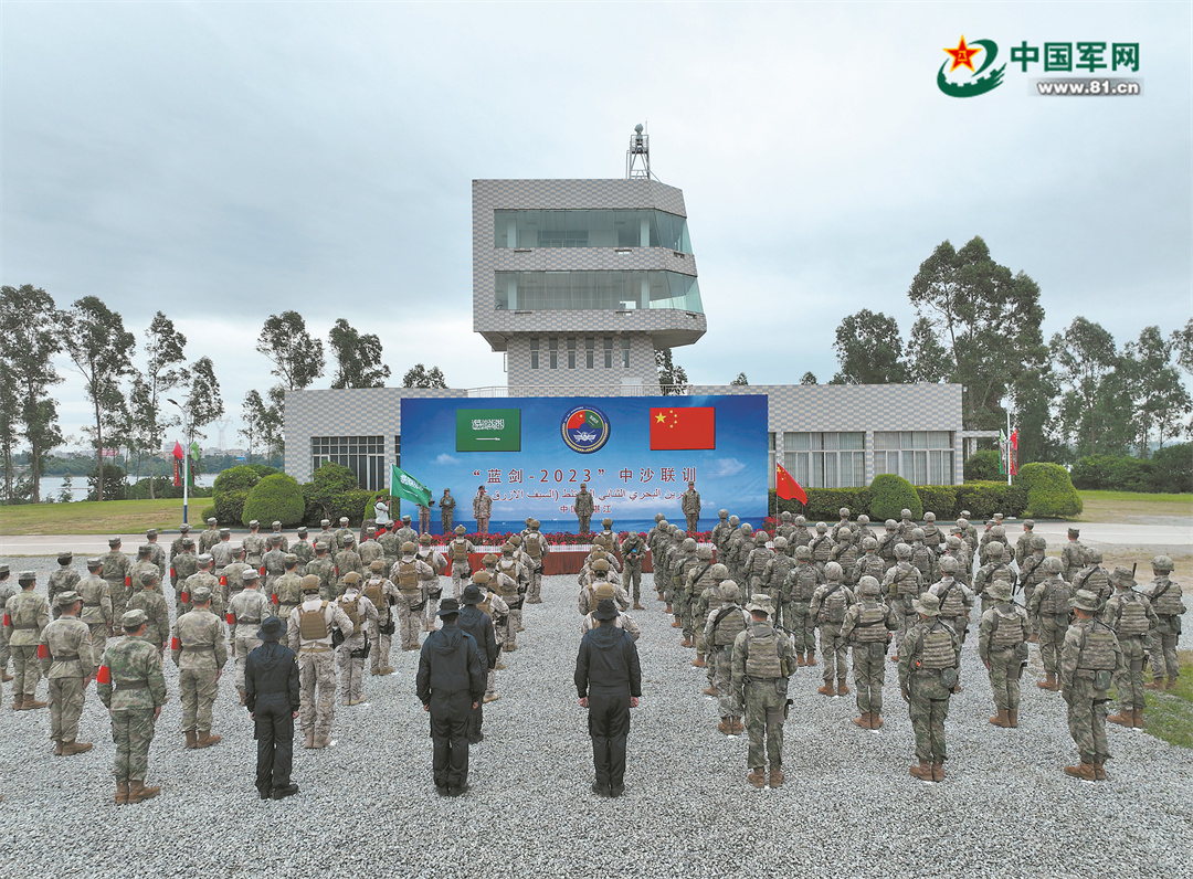 解放军报湛江10月9日电 记者陈晓杰、通讯员陈孝仁报道:今天上午,中国和沙特阿拉伯“蓝剑-2023”海军特战联训开训仪式在海军某旅营区举行,中沙双方100余名联训官兵参加了开训仪式。