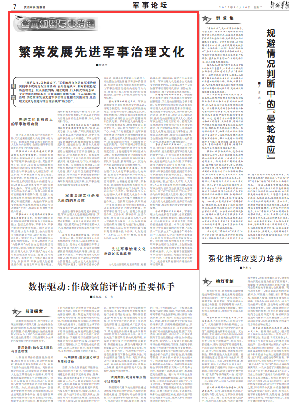 “观乎人文,以化成天下。”军事治理文化是在军事治理实践中形成的支配主体活动、官兵普遍认可、相对持续稳定的治理理念,以及价值判断、制度规则、行为模式等的总和。文化兴则治理体系兴,文化强则治理能力强。全面加强军事治理,要把繁荣发展先进军事治理文化摆在突出位置,让治理文化成为推进军事治理实践的“助力器”。