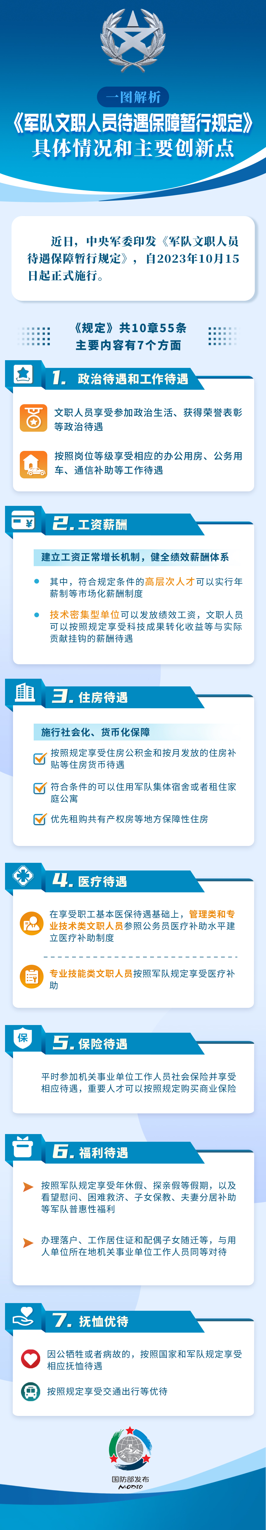《规定》共10章55条,主要内容有7个方面,下面我通过大屏幕做一个介绍:一是政治待遇和工作待遇。文职人员享受参加政治生活、获得荣誉表彰等政治待遇,按照岗位等级享受相应的办公用房、公务用车、通信补助等工作待遇。二是工资薪酬。建立工资正常增长机制,健全绩效薪酬体系。其中,符合规定条件的高层次人才可以实行年薪制等市场化薪酬制度,技术密集型单位可以发放绩效工资,文职人员可以按照规定享受科技成果转化收益等与实际贡献挂钩的薪酬待遇。三是住房待遇。施行社会化、货币化保障,按照规定享受住房公积金和按月发放的住房补贴等住房货币待遇,符合条件的可以住用军队集体宿舍或者租住家庭公寓,优先租购共有产权房等地方保障性住房。四是医疗待遇。在享受职工基本医保待遇基础上,管理类和专业技术类文职人员参照公务员医疗补助水平建立医疗补助制度,专业技能类文职人员按照军队规定享受医疗补助。五是保险待遇。平时参加机关事业单位工作人员社会保险并享受相应待遇,重要人才可以按照规定购买商业保险。六是福利待遇。按照军队规定享受年休假、探亲假等假期,以及看望慰问、困难救济、子女保教、夫妻分居补助等军队普惠性福利。办理落户、工作居住证和配偶子女随迁等,与用人单位所在地机关事业单位工作人员同等对待。七是抚恤优待。因公牺牲或者病故的,按照国家和军队规定享受相应抚恤待遇。按照规定享受交通出行等优待。