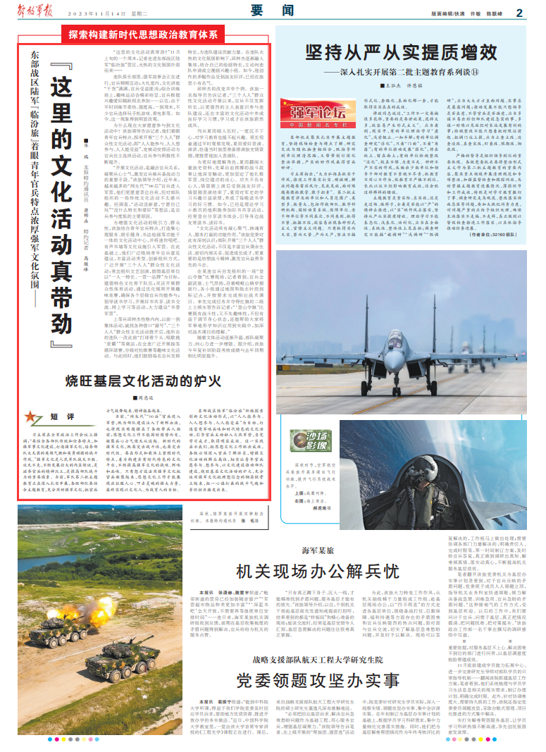 东部战区陆军“临汾旅”积极探索创新文化活动形式,以“人人能参与、人人想参与、人人能受益”为目标,打造富有军味兵味和时代特色的文化活动,引导官兵主动融入火热军营,自觉学习成才,取得明显成效。这一实践启示我们,把思想文化工作抓出成效,各级必须深入官兵了解诉求,增强文化活动的群众属性,切实让青年官兵愿参与、想参与,以文化建设推动部队建设,烧旺基层文化活动的炉火,充分运用强军文化把理想信念的钢筋铁骨立起来,把一心谋打赢的战斗气魄和责任担当激发出来。
